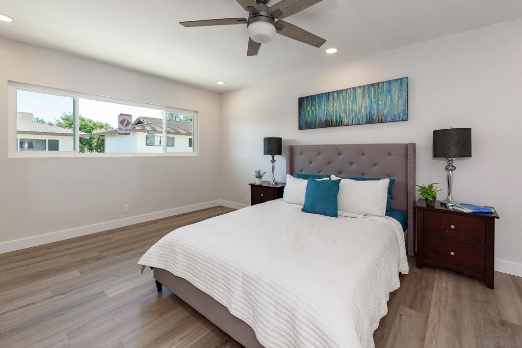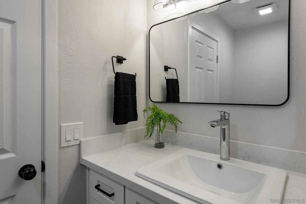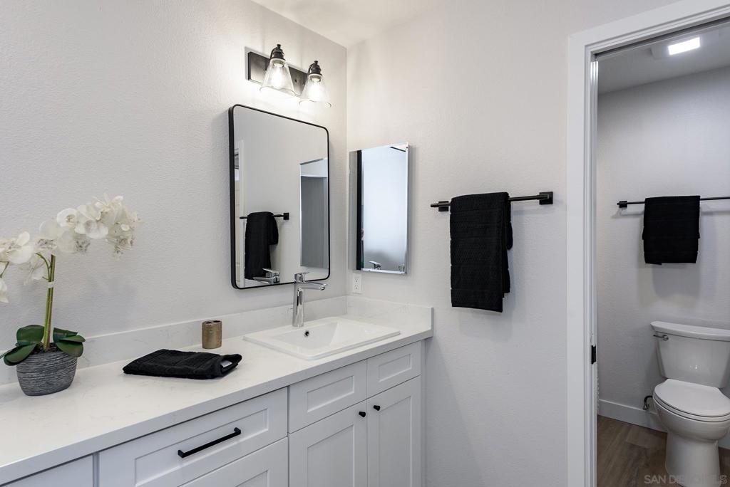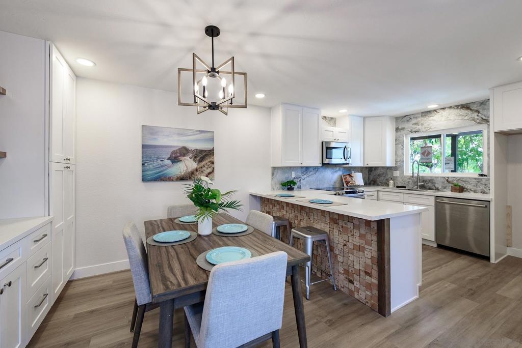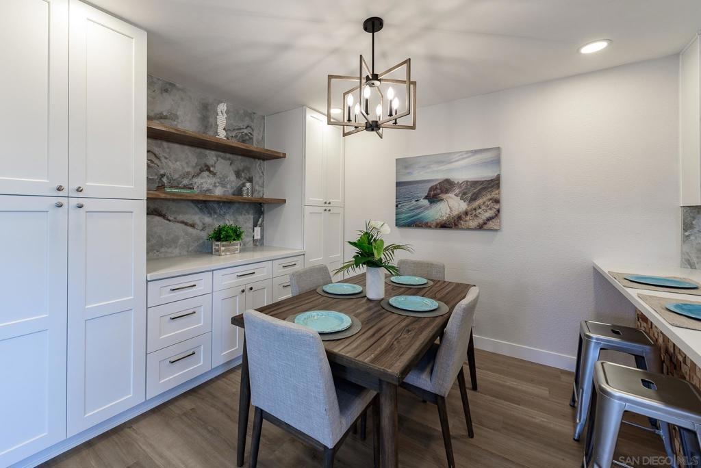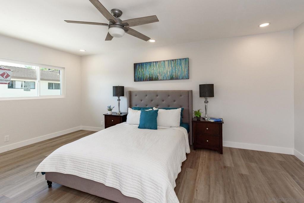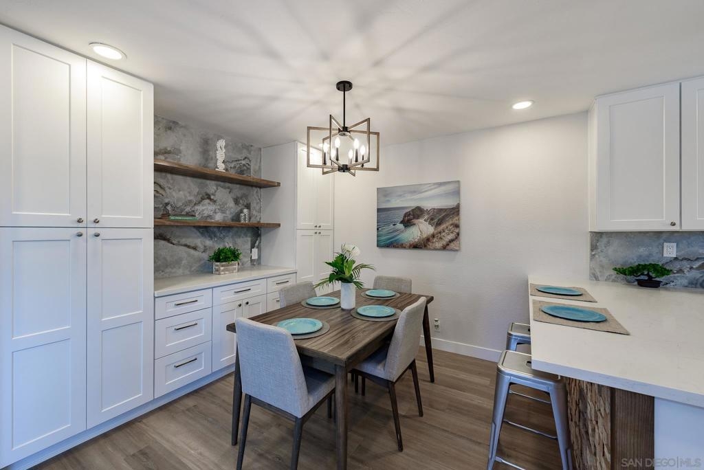 HUGE Price reduction! 2 Bd/1.5BA Beautifully reimagined interior remodel reflects the modern aesthetics of the moment. Optimally situated to capture southern/western exposure, this quiet upper unit single story home captures sunlight all day long through brand new energy efficient windows (warranty transfers to new owner). The dust is still settling from the recent remodel, which includes NEW: LVP flooring, Shaker cabinets, quartz counters, in-ceiling lights and ceiling fan, baseboards and molding, doors, bathroom. See SUPP: Woodworking craftsmanship on display under the peninsula counter and custom stained shelving. Stainless steel appliances. In-unit stacked laundry closet. New epoxy garage floors. Centrally located near HOA pool. Complex has many mature trees offering cool breezes and beautiful landscaping. Walk to Mt Carmel High, shops, restaurants and more. Sited nicely in a quiet part of the complex facing Caminito Cuadro, not a busy street or freeway.